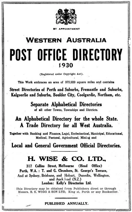 Post Office Directory courtesy of the State Library of Western Australia. The originals can be viewed on the State Library of Western Australia’s website: Original Post Office Directory.