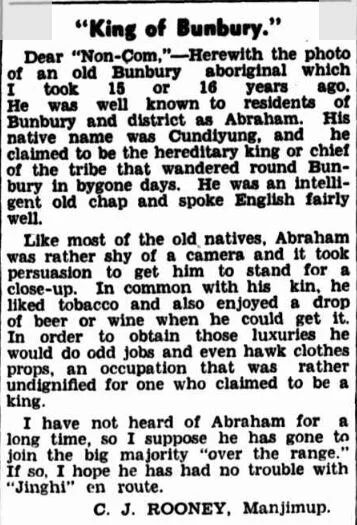An Aboriginal named Abraham competed in a sporting event in Narrogin in 1916 and came first in the 440-yard handicap race (400 metres) (reference). However, based on the known photograph of Cundiyung taken circa 1920, it is likely not the same man as he appears to be too old to compete in this sport. However, this is a judgement made on an old photograph and many people remain athletic despite their advanced age - so it could possibly be the same man.