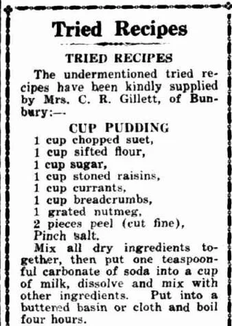 Mix all dry ingredients together, then put one teaspoonful carbonate of soda into a cup of milk, dissolve and mix with other ingredients. Put into a buttered basin or cloth and boil four hours.