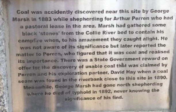On the plaque at the discovery site, Mr Marsh, Mr Perren and Mr Hay are all acknowledged in the discovery of coal (reference).