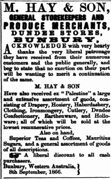 The Hays and Eliza Hill arrived in Fremantle on 26 March 1863 (reference). From there, they went to Bunbury, and it didn't take them long to settle in. By October that year, David had set up as an auctioneer and advertised his Aunt's property in Minninup for auction (reference). Soon after arrival, Mrs Hay and David took over a business from Mr Hyman Lipschitz located in the Canberra Buildings in Victoria Street. They began trading as M. Hay & Son (reference). A few years later, they acquired a parcel of land from Mr Lipschitz on Victoria Street that stretched from Wellington Street to Prinsep Street. They converted a pre-existing building on this land to the "Dundee Store", named after their hometown in Scotland. This store was located at approximately 113 Victoria Street, where Sports Marine store currently sits (reference). The store sold a mixture of goods, including fresh produce, drapery, cutlery, ironmongery and confectionery (reference).