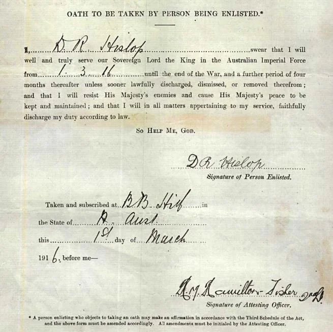 When the call to arms came to Australia, Donald and his older brother Percy answered the call together. The brothers travelled to Blackboy Hill and signed up for the Australian Infantry Force on 29 February 1916. Percy was first in line and was allocated service number 4445, followed by Donald with 4446 (reference; reference). They were assigned to the 28th Australian Infantry Battalion, 11th reinforcement (reference; reference; reference). On 1 March 1916, Donald took an oath to serve the King in the Australian Imperial Force (reference). According to his military records, before Donald travelled to Blackboy Hill on 14 February, he underwent a military medical examination in Bunbury (reference).