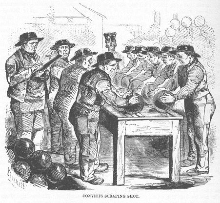 On the “Defence” there were three decks, housing (at the time of the 1854 report) 424 prisoners. The higher the deck, the better the conditions as not only was the air fresher, but there were less men housed on the top deck, 105 compared to 190 on the bottom deck. Conditions were cramped and demoralising. Each deck had cages where prisoners slept in hammocks that were stowed away during the day. Tables that prisoners ate their meals at were stowed away at night. The majority of prisoners worked ten hours a day at nearby Woolwich arsenal on cleaning shot and shell, making and repairing grummets and wads and sundry labouring roles. Some remained on board taking care of the sick and cleaning duties. A small gratuity could be earned which was held in trust until the prisoner was released. The better the prisoner’s conduct the higher the gratuity. Education and prayers were a daily activity. In 1854, five prisoners tried to escape, with only one being successful. Punishment for this would be a number of days in dark solitary confinement with food rations being just bread and water. Those not in confinement had three meals a day consisting of bread, a small amount of meat, few potatoes, soup three days a week, replaced by gruel the rest of the week. Sick prisoners received bread and gruel only. The convict graveyard was in nearby Plumstead Marshes that contained no grave markings.