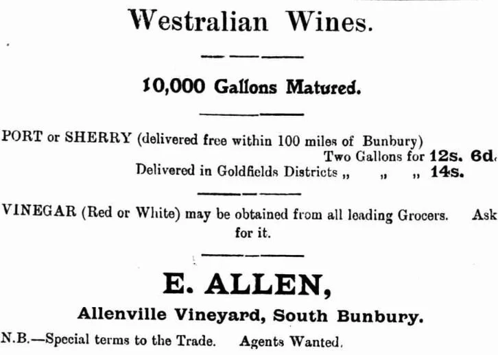 After the wedding, Emily moved in with her husband. Emily remained at Allenville in Gelorup for the rest of her life (reference; reference; reference; reference; reference; reference). Her husband Eli was a vigneron by trade, working on his farm, Allenville Vineyard and Orangery, established in 1904. The property was first listed as being South Bunbury before it was Gelorup.