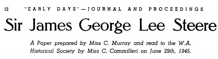 “This paper is a short account of the life and work of the late The Hon. Sir James George Lee Steere, Knight Commander of St. Michael and St. George, of Perth and Jayes, Blackwood, Western Australia, which district he represented in Parliament for 40 years, 1863-1903, the year of his death. Sir James Lee Steere was also for 22 years a member of the Legislative Council. For five years he presided over its deliberations, and later became first Speaker of the Legislative Assembly of the State until his death. He was a member at the same time of the Federal Council of Australasia. By his death the State lost a good citizen and Parliament an able, just and fair-minded President over her Councils; for, when the doubts and difficulties of the pioneer had given way to the prospect of assured success, and the young Colony had assumed the responsibilities of self-government, he continued, both in and out of Parliament, to assist in guiding the destinies of State, and also, both in the mercantile and pastoral pursuits, throughout his long career, kept in touch with the conditions and advancement of the country. In the history of Western Australia, the name of Sir James Lee Steere will occupy a prominent and honoured place and will live long in the memory of the people he served so faithfully.