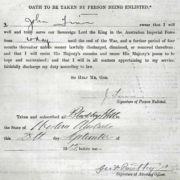 John lived in Bunbury and worked for the Western Australian Government as a railway employee (reference; reference; reference). He was single and twenty-nine years old when he signed up for war (reference). John was described as 5 feet 9 inches with a medium complexion, blue eyes, dark hair and a ginger moustache (reference; reference). He also had a mole on the back of his neck (reference).