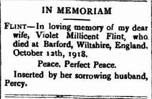 Suffering rheumatism and fibrositis, Percy returned to Australia aboard the Hospital Ship Somali and was discharged as medically unfit on 23 March 1919. For several years after Violet’s death he placed notices in several newspapers, “In memoriam Violet Millicent Percy who died 12 October 1918 at Barford, Wiltshire, England.” (Reference).