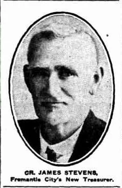 In 1932 Cr. James Stevens, one of Fremantle's "civic fathers," was appointed City of Fremantle Treasurer. He had come from Victoria, but was a ‘Portonian’ of 35 years' standing. Twenty-three years of that time he served as an accountant for butchers Messrs J. and L. Baker, and then as a real estate agent. (reference)