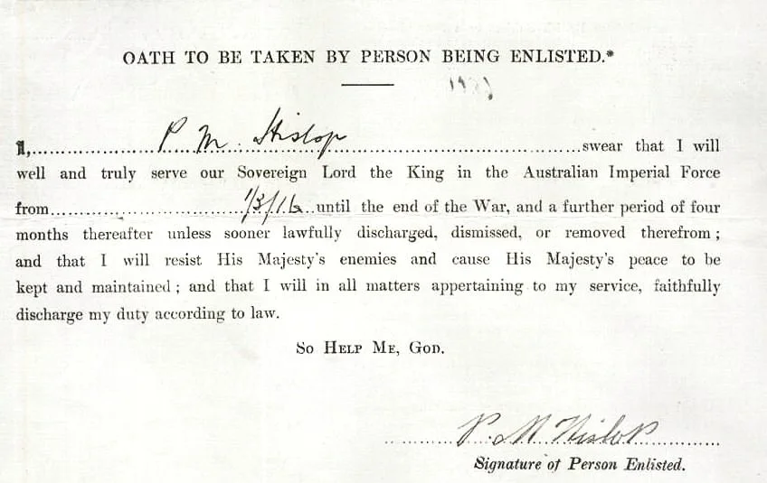 When the call to arms came to Australia, Percy and his younger brother Donald answered the call together. The brothers travelled to Blackboy Hill and were accepted into the Australian Infantry Force on 29 February 1916 (reference). Percy was first in line and was allocated service number 4445, followed by his younger brother Donald who received service number 4446 (reference; reference). They were assigned to the 28th Australian Infantry Battalion, 11th reinforcement (reference; reference; reference; reference). On 1 March 1916, Percy took an oath to serve the King in the Australian Imperial Force (reference). According to his military records, before Percy travelled to Blackboy Hill on 14 February, he underwent a military medical examination in Bunbury (reference; reference). This medical examination record also says he applied to enlist into the Australian Infantry Force on 22 February 1916 (reference; reference).