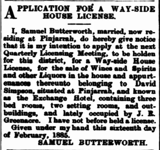 Samuel retired from policing to take over the Exchange Hotel at Pinjarra on 12 George Street in 1885 which he was the proprietor and owner for several years (reference; reference). The Exchange Hotel was a baiting house when coaches plied between Perth and Bunbury (reference). In February that year, he announced in The Inquirer and Commercial News his intention to apply at the Quarterly Licensing Meeting for a Way-side House License to sell wines and spirits at the Exchange Hotel in Pinjarra (reference). He then announced that The Exchange Hotel would open on 1 April 1885 as a first-class roadside hotel, supplying the best brands of wines, beers, spirits, lemonade, ginger ale and cordials, and good stabling for guests' horses (reference).